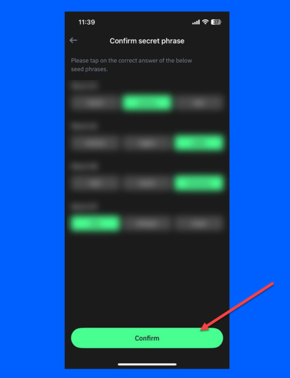 9. Confirm your seed phrase. You’ll be asked to select four words from your seed phrase in the correct order to ensure you’ve written them down correctly.
